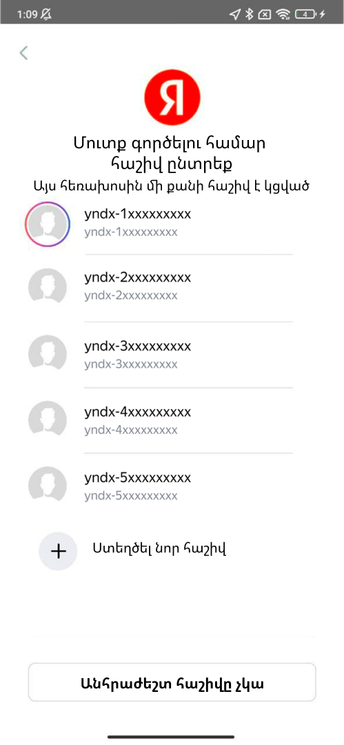Yandex Pro-ն ցույց կտա Yandex ID-ի ձեր բոլոր հաշիվները, որոնցից օգտվել եք այս սարքում Yandex-ի այլ ծառայություններում։